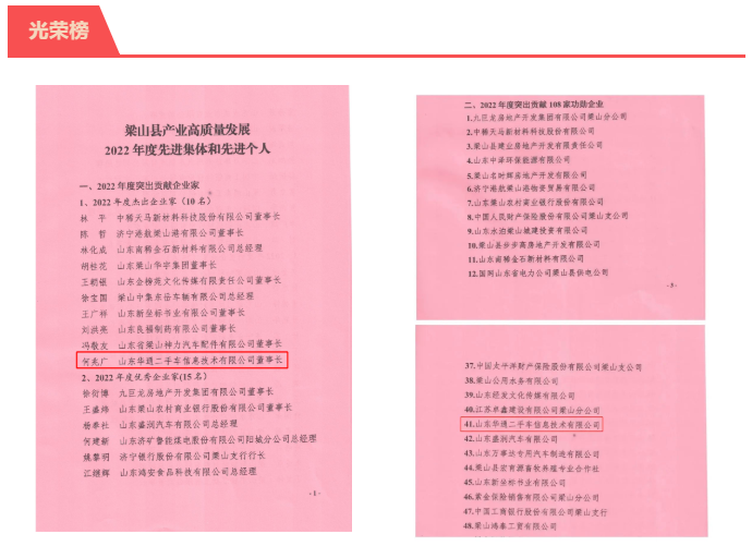 2月21日,“梁山县产业高质量发展暨招商引资大会”在梁山会堂召开,大会对在推进全县经济社会高质量发展中业绩优良、社会贡献大、创新能力强的先进集体和先进个人进行表彰,其中授予广安集团旗下的蜗牛货车网(山东)电子商务有限公司(下称:蜗牛货车)“2022年度外向型发展先进企业”,授予山东华通二手车信息技术有限公司(下称:华通信息)“2022年度商贸流通服务业先进企业”、“2022年度突出贡献功勋企业”,授予公司董事长何兆广“2022年度杰出企业家”称号。何兆广同志受邀出席会议并登台领奖。
