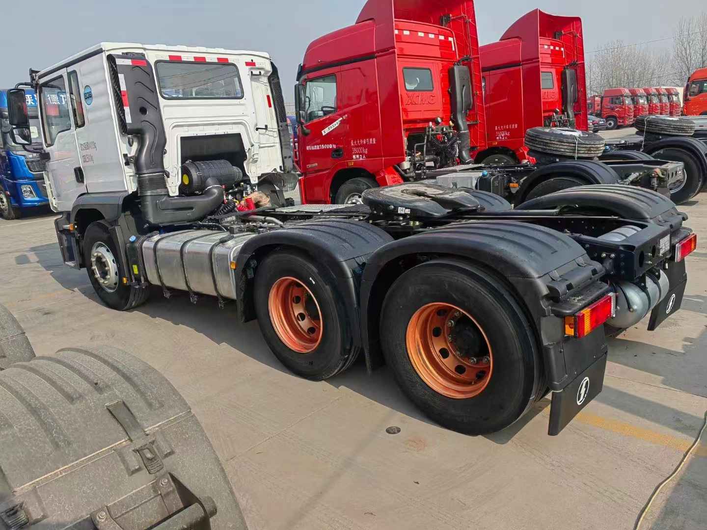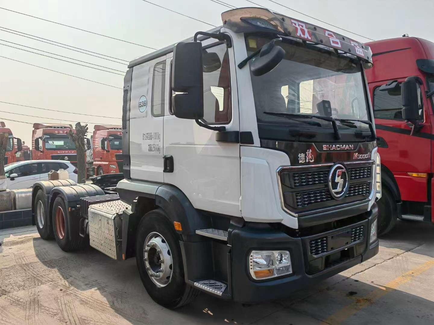 新到梁山华通二手车市场一台白色的德龙矮顶牵引车,陕汽德龙M3000S牵引车,22年7月上户,潍柴12升460马力发动机,法士特(自动怀挡)变速箱,法士特液力缓速器,前二后三板簧,陕西汉德后桥,速比是3.7,全国可提档可分期。